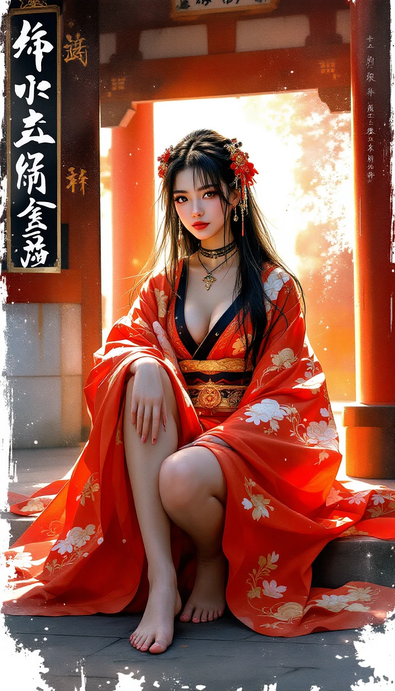 Full body view of OBxiaoxiang, inksplash portrait of stunning oriental princess stting outside shinto shrine, long hair, sidelocks, bangs, hair ribbon, earrings, necklace, choker, red and gold kimono, Barefoot, direct gaze, light hitting one side of face, gradient colour background, Japanese kanji