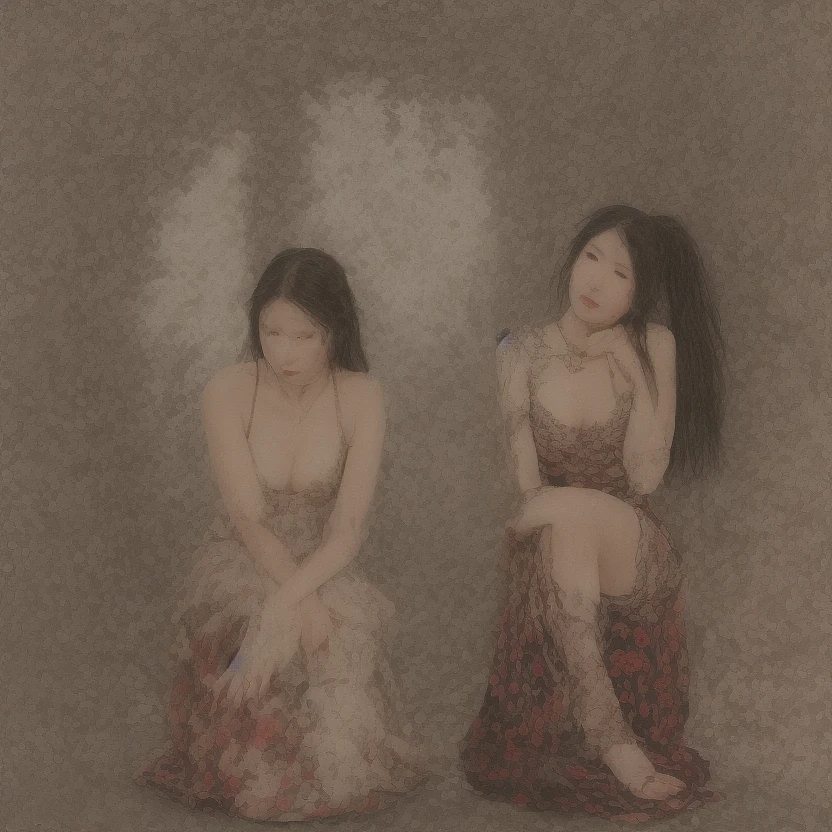 Two beautiful alluring Japanese women, sit in a serene field of red roses, right hand of each on the other, each with long jet black hair, black, gold and silver intimately ornately detailed halter leather top and bottom embellished with red gemstones, steel black iron bands encircle each of their necks, wrists and ankles adding a touch of mystery. Exquisite, photorealistic face, precise cosmetic features. Stunning, detailed eyes. Full, luscious lips, radiant skin. Hip-length luscious black hair, cinematic, high detail, extreme details, masterpiece, detailed gorgeous face, cosmetic textures, Realistic face, cosmetic features, highly Detailed face, Detailed eyes. 8k, sharp focus, cinematic lighting, highly detailed, breathtaking, photography, stunning environment, wide-angle,