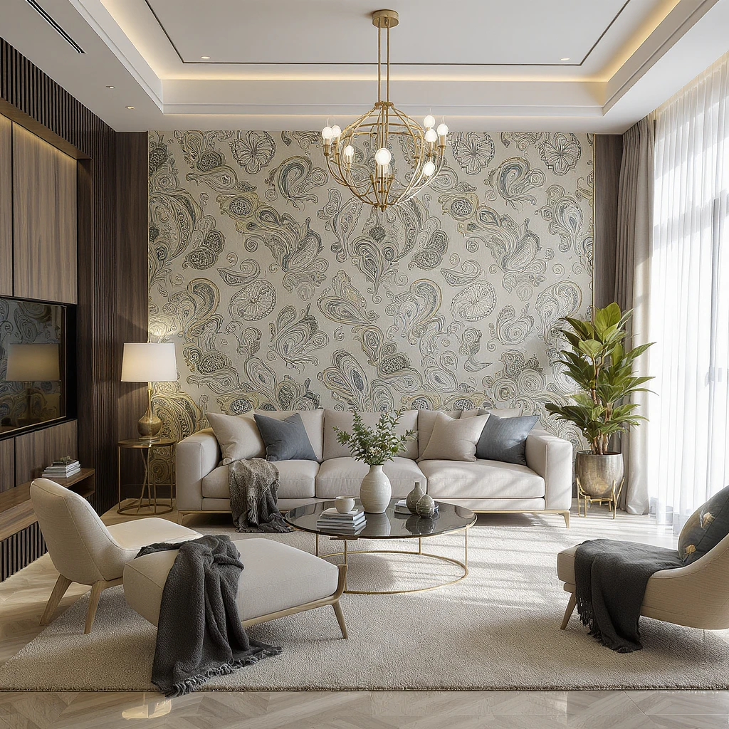 hyper-realistic modern living room with a Paisley theme