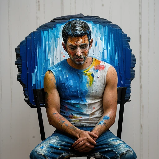 sad man sitting on chair, eyes are teary, holding face, pallet knife painted, thick textured, thick layers of paint,