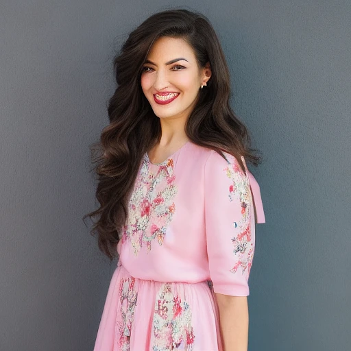 Envision a virtual influencer who exudes a blend of traditional charm and contemporary grace. She has a welcoming smile and eyes that sparkle with intelligence. Her attire is a modern take on traditional fashion—a long, flowing dress with a cinched waist, adorned with a pattern of vibrant pink and white florals on a serene blue background. Her hair is styled in soft, natural waves, and she accessorizes with tasteful, minimalist jewelry. The influencer is poised inside a brightly lit, modern shopping mall, with an air of confidence and accessibility that draws you into her world.