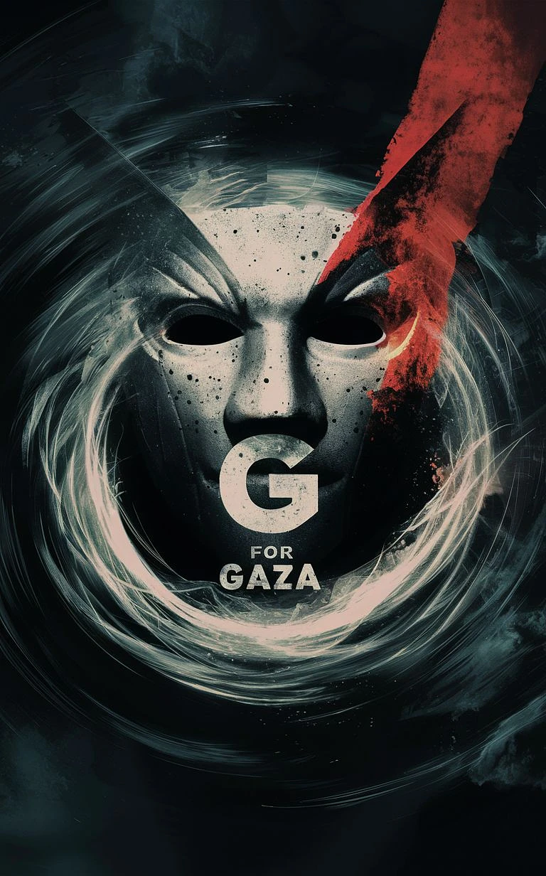 Create a poster for a film titled "G for Gaza", using the mask of V for Vendetta as a symbol of the struggle for social justice. Use a dark and dramatic color palette to create an intense atmosphere, while incorporating visual elements that represent social movements and struggles for human rights around the world.