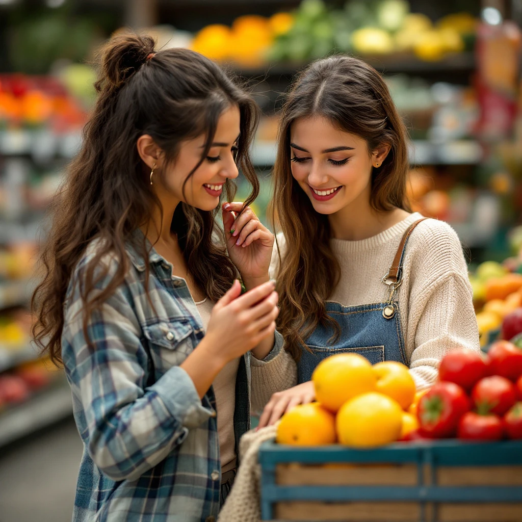 a beautiful house wife and pretty daughter go to supermarket, buy fruit, Rich colors.