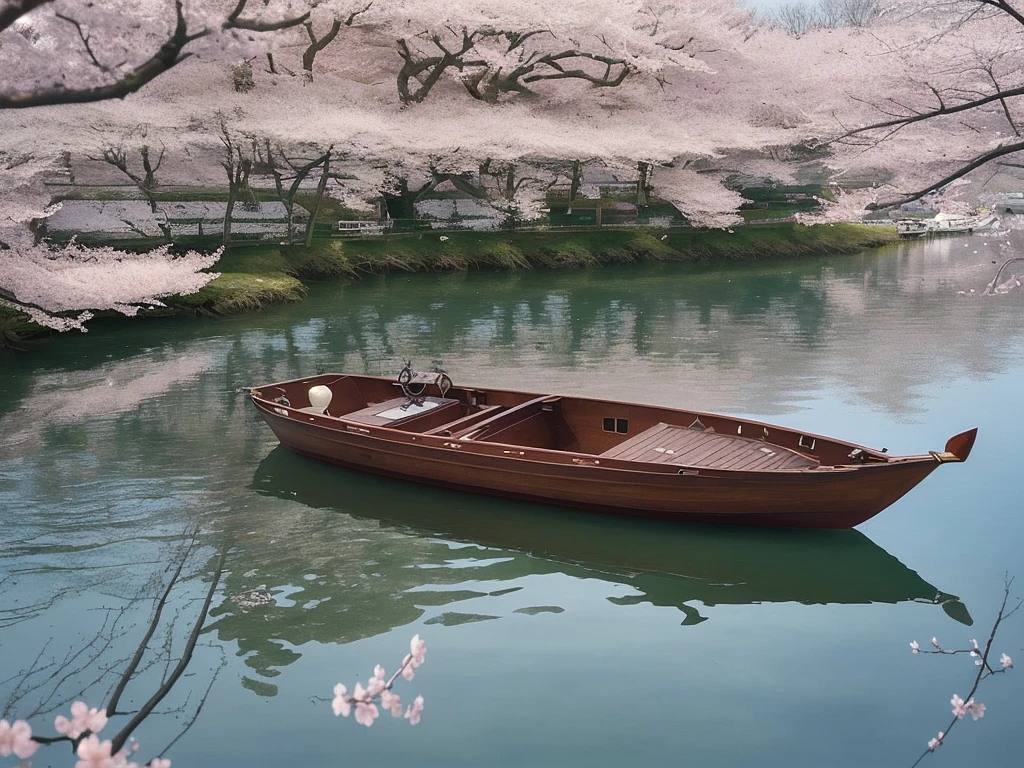 a serene and idyllic scene of a wooden boat floating on a calm body of water, with a stunning cherry blossom tree in the background. The atmosphere is peaceful and tranquil, with a sense of stillness that invites the viewer to step into the scene. The boat is positioned in the center of the image, facing to the right, with its pointed bow pointing towards the shore. The boat's hull is made of dark brown wood, with visible grain and texture that adds a sense of authenticity and realism. The boat has a flat bottom and a pointed stern, with a subtle curve to the hull that suggests a sense of elegance and refinement. A few subtle scratches and scuffs on the hull add a sense of wear and tear, suggesting that the boat has been well-used and well-loved. In the background, a stunning cherry blossom tree rises from the shore, its delicate pink flowers bursting forth from the branches like a cloud of cotton candy. The tree's trunk is sturdy and strong, with a subtle gnarl to the bark that suggests age and wisdom. The branches are slender and delicate, with a subtle curve to the limbs that adds a sense of elegance and refinement. To the right of the tree, a traditional Japanese-style building rises from the shore, its pagoda-style roof and stone lantern adding a sense of cultural and historical significance to the scene. The building's walls are made of a warm, honey-colored stone, with a subtle texture to the surface that adds a sense of depth and dimensionality. The roof is a deep, rich brown, with a subtle curve to the tiles that adds a sense of elegance and refinement. The water is calm and peaceful, with a subtle sheen to the surface that suggests a sense of serenity and stillness. A few subtle ripples and waves disturb the surface, adding a sense of movement and energy to the scene. The surrounding environment is peaceful and tranquil, with a few pink petals floating on the water's surface and a subtle sprinkling of cherry blossoms around the shore. The sky above is a soft, hazy gray, with a few wispy clouds scattered across the surface. The lighting is soft and diffuse, with a subtle warmth to the tone that suggests a sense of comfort and relaxation. The camera perspective is wide-angle, providing a sense of depth and space that draws the viewer into the scene. The lens used is likely a wide-angle lens, with a focal length of around 24mm or wider. The style of the image is reminiscent of a classical Japanese landscape painting, with a focus on simplicity, elegance, and refinement. The use of soft lighting, muted colors, and subtle textures creates a sense of serenity and stillness, drawing the viewer into the peaceful world of the image.