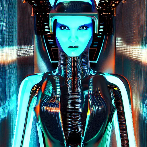 Futuristic woman, close-up, cyberpunk, neon lights, H. R. Giger, Syd Mead, Robert Valley, digital art, 3D render, realistic, high detailed, award-winning, 8k resolution, Intricate detail, stylized, posed.