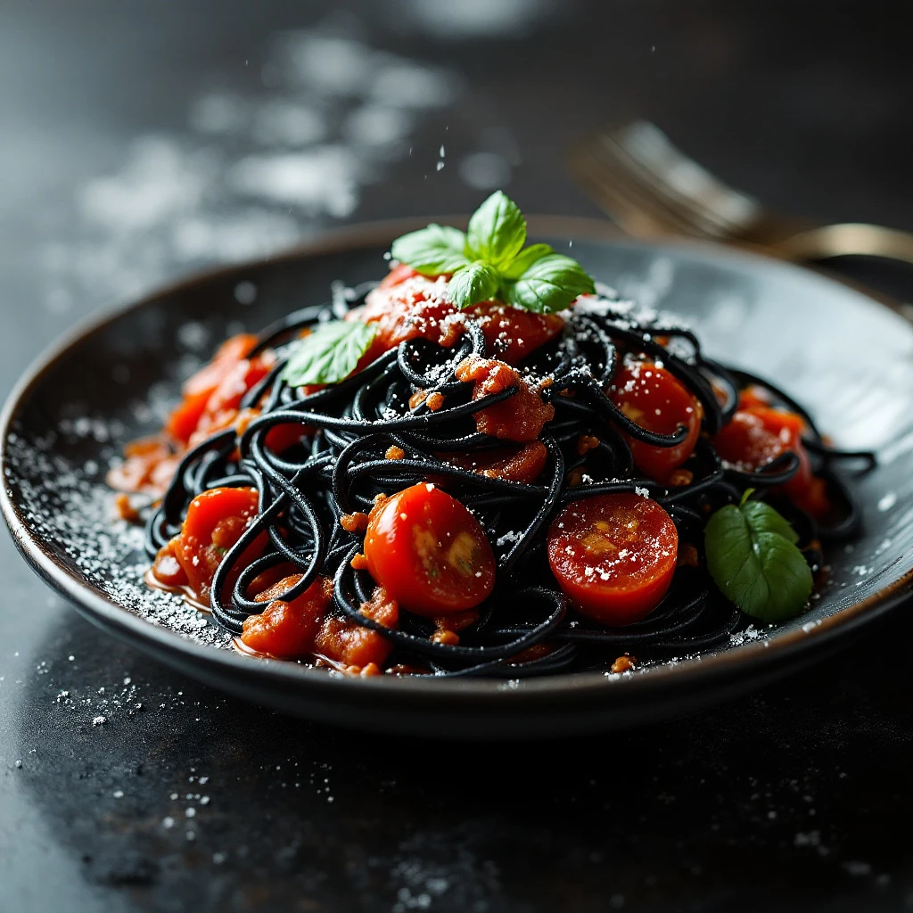Extreme close-up, a plate of black spaghetti with marinara sauce, , photorealistic, in the style of high quality food photography --chaos 20 --ar 1:2