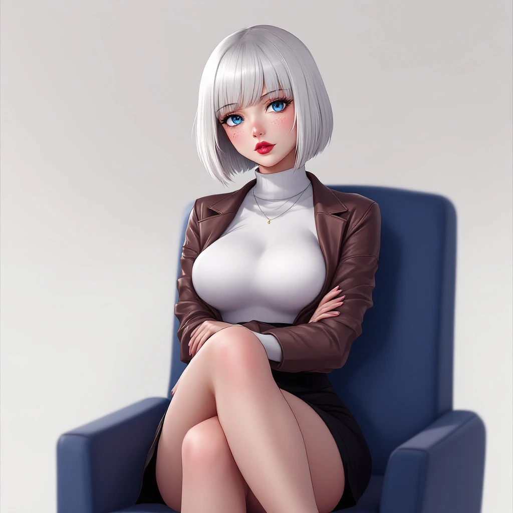 anime, woman, white hair, bob cut, blue eyes, freckles, red lips, white turtle neck sweater, tight turtle neck sweater, short leather jacket, brown leather short jacket, black tight skirt, short skirt, bare legs, black high heels, bored expression, sitting on a chair, sitting with legs crossed, big chest, arms crossed, stockings