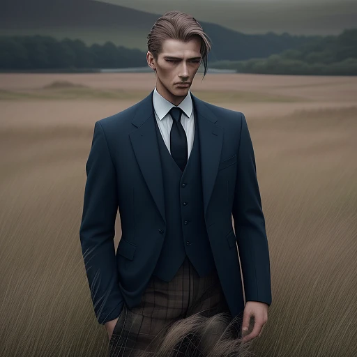 a man stands with his head down in some tall grass, in the style of fashion photography, scottish landscapes, light bronze and dark blue, deconstructed tailoring, genderless, close-up shots, brooding mood --ar 132:161 --s 750 --v 5. 2