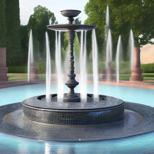 Create an image of a round fountain 8meter wide with eight water jets on the edge distributed equally around and one central water jet the fountain has black granite up-stand all around and mosaic tiles in side the fountain, hyper detailed, hyper realistic photo, 4k render