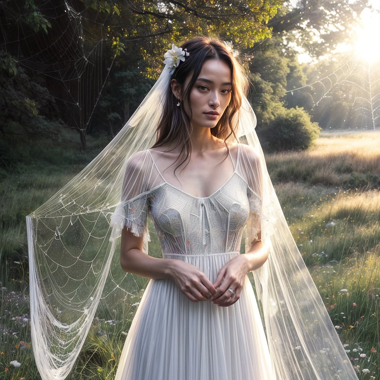 epic realistic, DV_Melody_Vicious, portrait painting of a beautiful girl, style of fragonard and Yoshitaka Amano (white hair with flowers, messy) , ropes, brigfht, daytime, ((daytime meadow background with light shafts) ), bioluminescent, (wearing intricate frock) , vines, delicate, bright colors, soft, fireflies, (((spiders, spider webs, webs) )), silk, threads, ethereal, luminous, glowing, dark contrast, celestial, ribbons, trails of light, 3D lighting, soft light, UHD, HDR, 8K, (Masterpiece:1. 5) Model: Dark Sushi 2. 5D, (Masterpiece:1.3) , (best quality:1.3) , <lora:add_detail:0.4> <lora:epi_noiseoffset2:0.4> <lora:hairdetailer:0.6> <lora:more_details:0.3> <lora:add-detail-xl:1.2> <lora:DetailedEyes_V3:1.2> <lora:sd_xl_offset_example-lora_1.0:1.2> , (natural skin texture, hyperrealism, soft light, muted colors) , background, rutkowski, rim light