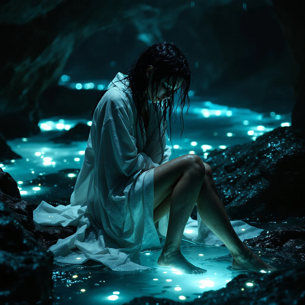 young woman, long white robe, black hair, wet hair, wet skin, wet robe, sitting in dark cave, bioluminescent cave lake, sad, abandoned, eyes closed, running makeup, nighttime, closed cave, sorrowful, beautiful, perfect legs, intricate detail, highly detailed, Adrien Merigeau <lora:monstyle3:1.0> <lora:Muted Rainbow:1.0> <lora:Perfect Balance:1.0>