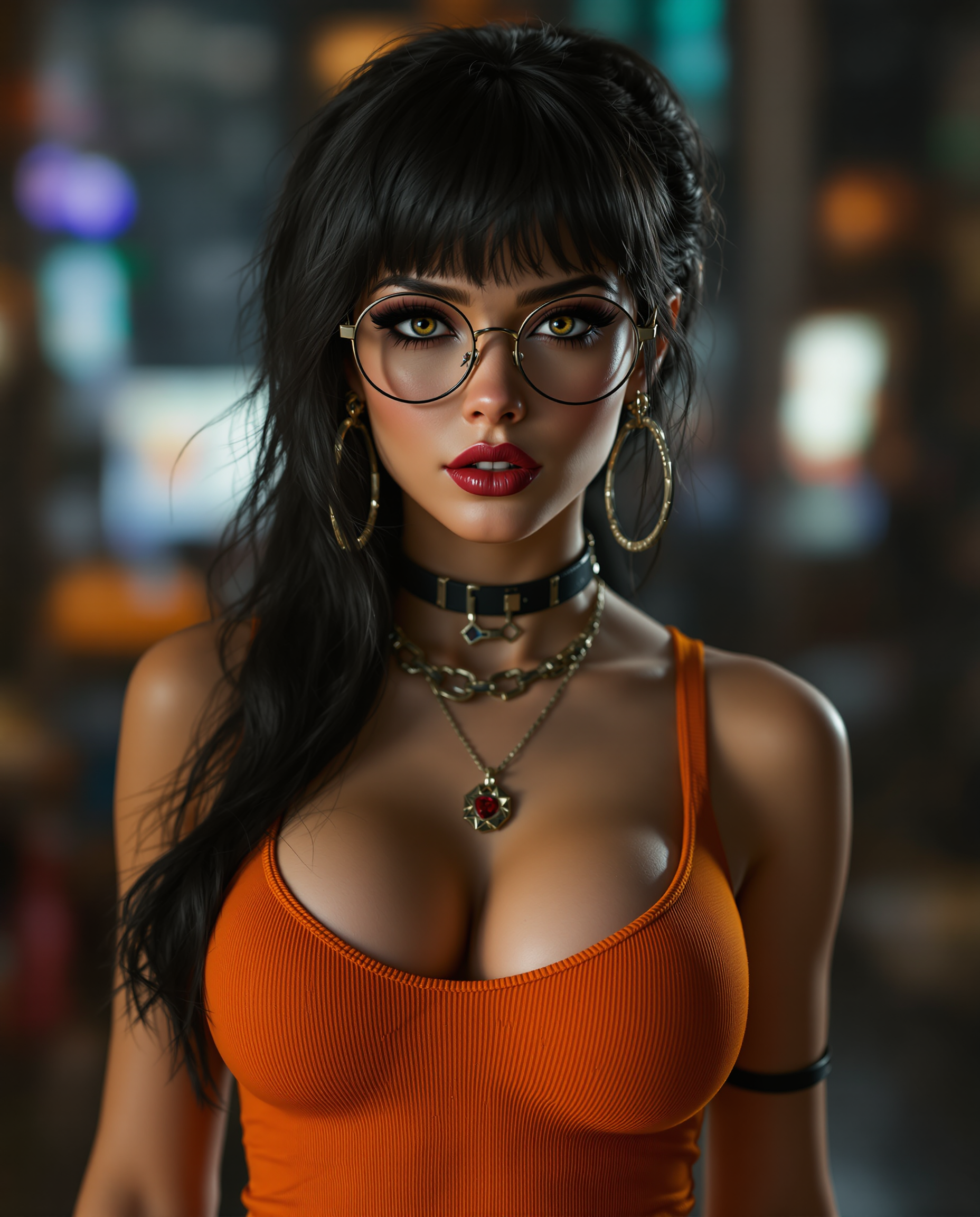 Photo of a ultra realistic of velma from scooby-doo, very sultry look, so hot girl, beautiful charismatic girl, so hot shot, showing piercing, athletic body, a woman wearing eye glasses and an orange top, gorgeous figure, full body shot, goth style mood, dark eye makeup, in the style of jessica drossin, life-size figures, 4k, hyper realistic, focused, extreme details, unreal engine 5, cinematic, masterpiece,, intricate