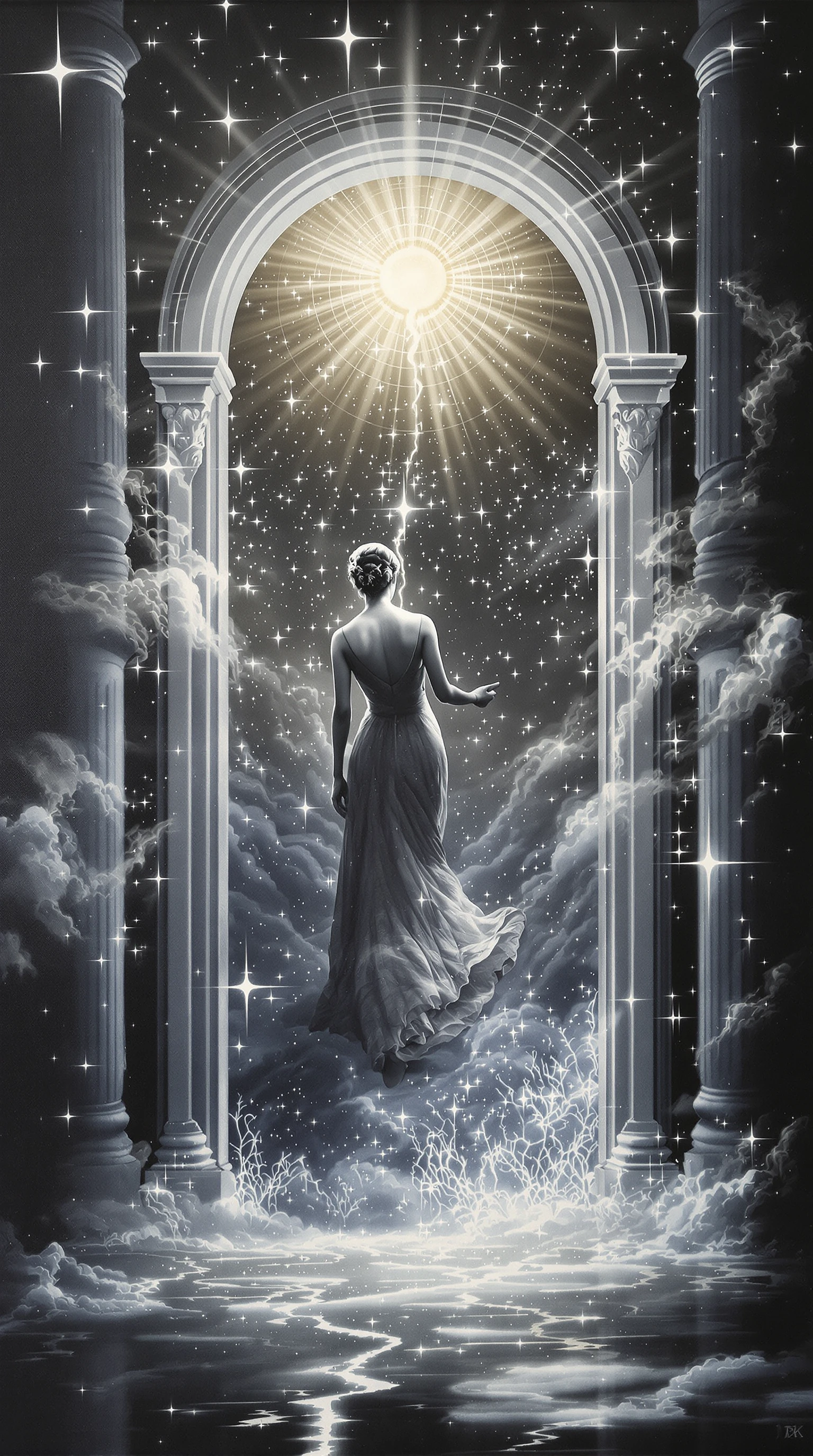 Macroview of a canvas in shape of a holographic gate to heaven, a beatiful middle aged woman oil panting is painted on the canvas, woman is getting one foot to the world from the holographic side behind the canvas, ultrarealistic, haunted environment, monochromatic, 8K.