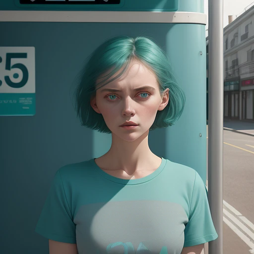 woman in heather deep teal t-shirt standing in front of bus stop, Oleg Oprisco style, video, Jocelyn Hobbie, soft muted tones, close-up, undulating, Nick Knight --ar 36:55 --stylize 750 --v 6