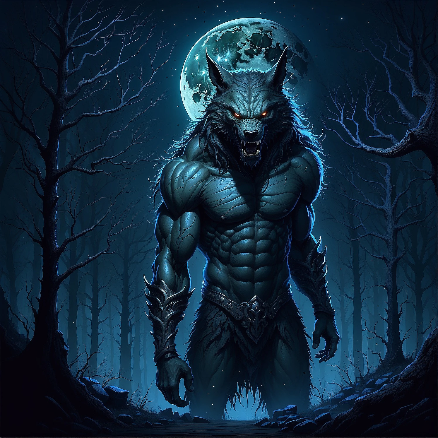 As the full moon rises above the dark and foggy forest, a majestic werewolf stands tall, its fur glistening in the moonlight. The twisted trees and eerie mist create an ominous atmosphere, adding to the mystery and danger of this powerful creature. Rendered in a realistic style, this image captures the raw power and beauty of the werewolf as it howls at the moon.