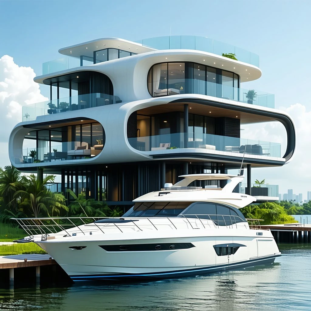 a closeup of a futuristic multi story home on stilts in the water with a sport fish boat to feet long tied to a dock in front
