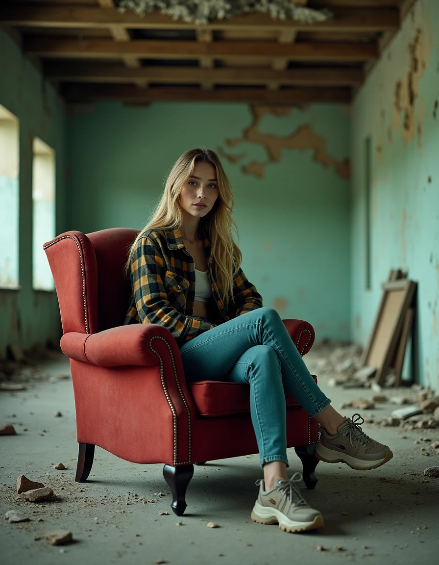 [young woman seated confidently in a decaying abandoned room] , sitting on a worn red armchair, surrounded by rubble, cracked plaster walls, and a broken ceiling with exposed beams. Dressed in teal jeans, a plaid flannel jacket, and chunky sneakers.