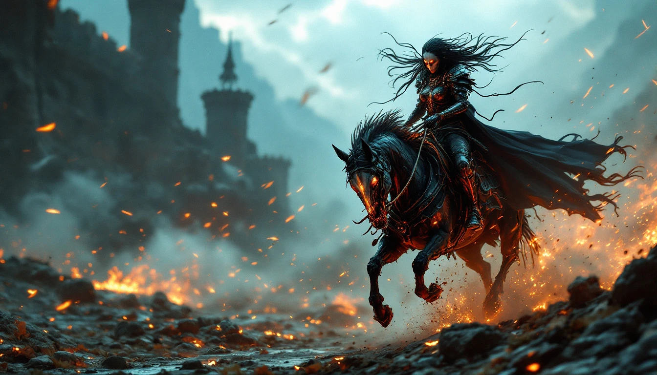 A female undead death knight on horseback charging into battle, trail cam footage, intense coloration fantasy, full body image, RAW photo, (masterpiece) , (extremely intricate:1.3) , (realistic) , cinematic lighting, detailed skin, highly detailed, extremely delicate and beautiful, 8k, high quality, highres, sharp focus, extremely detailed, during the day, extremely detailed eyes and face, masterpiece, cinematic lighting, (high detailed skin:1.2) , 8k uhd, dslr, soft lighting, high quality, film grain, Fujifilm XT3