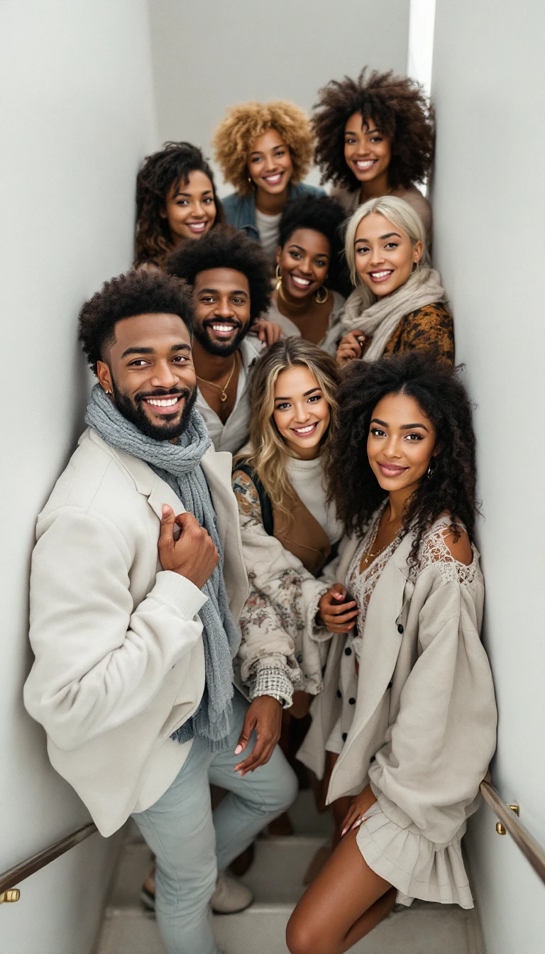 Photo of a 8 ultra realistic friends, different races of people, in a tight white modern stairway, men and women, in their 30s and 40s, some facing the camera, smiling, fashionable, in the style of hyper-realistic National Geographic photography, expressive, hyperrealism, photorealistic, detailed hair, hyper detail, cinematic lighting --ar 1:2 --stylize 750