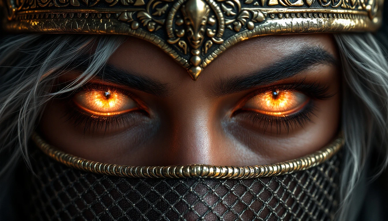 Ultra-realistic . Close-up of Parushat’s eyes slowly closing, the light of life fading from them. [Parushat: deep Achaemenid Persian eyes, framed by strong brows, gray hair visible under her engraved Achaemenid helmet with chainmail veil.]