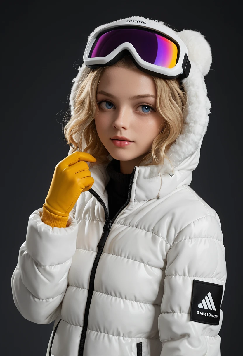[Model wearing a white puffer jacket with subtle quilting, oversized dark teal faux fur hood, reflective ski goggles with a purple gradient lens, and bright yellow quilted gloves with exaggerated padding. The textures of the outfit are luxurious and bold, creating a winter-sport-inspired aesthetic.]