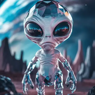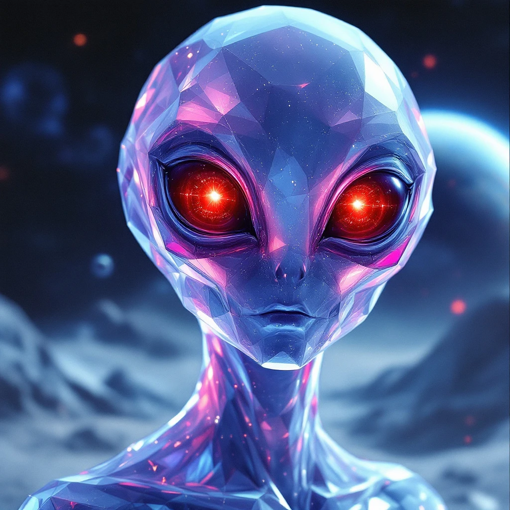 an alien made of crystal::2 big shiny red eyes, soulful eyes::planet in the background --v 4 --q 2 --ar 9:16