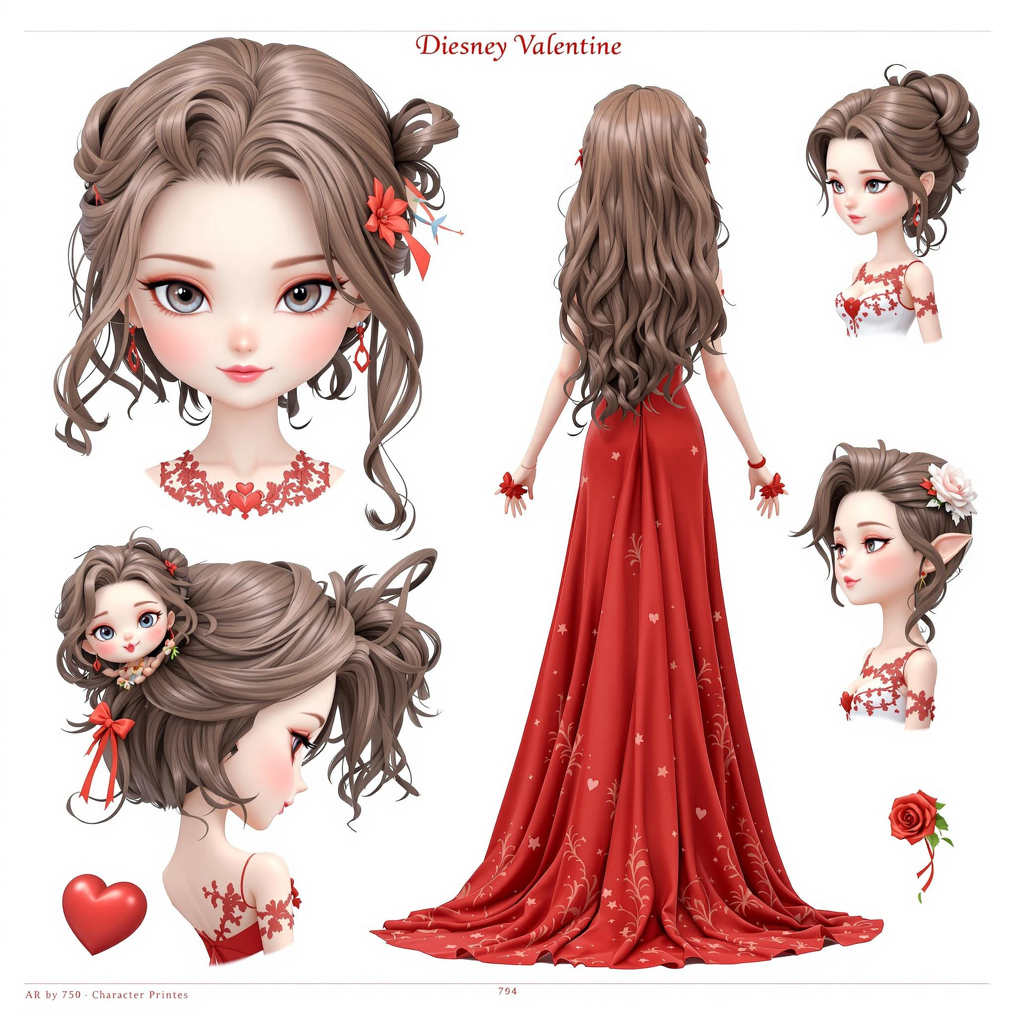 Character sheet,diesney valentine, Girl with fasened top hair,not open hair, top fasened hair, 3d printed, red big gown, fully visible gown, with lowest detail, unique, creative, doll, Multiple poss and expressions,Highly detailed,Depth,Many parts --ar 3:4 --s 750
