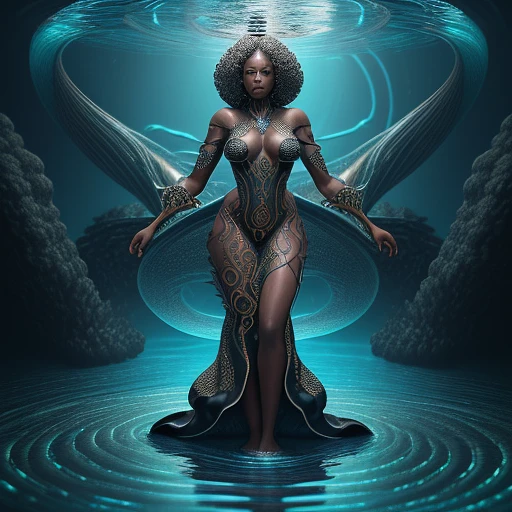 beautiful black woman Queen of ocean in spiral wave water, not showing face, background glorious , perfect face, realistic, full body, standing on ground, circuit board, in royal clothing, fantasy, illustration, artstation, very complex hyper-maximalist overdetailed cinematic tribal darkfantasy, 8k resolution, Ultra-detailed Quality 3D Octane Render, photorealistic concept art, Sharp Focus, Perfect Composition, intense shadows, intense lighting, wallpaper, HDR, high quality, high-definition --stylize 1000 --ar 2:3
