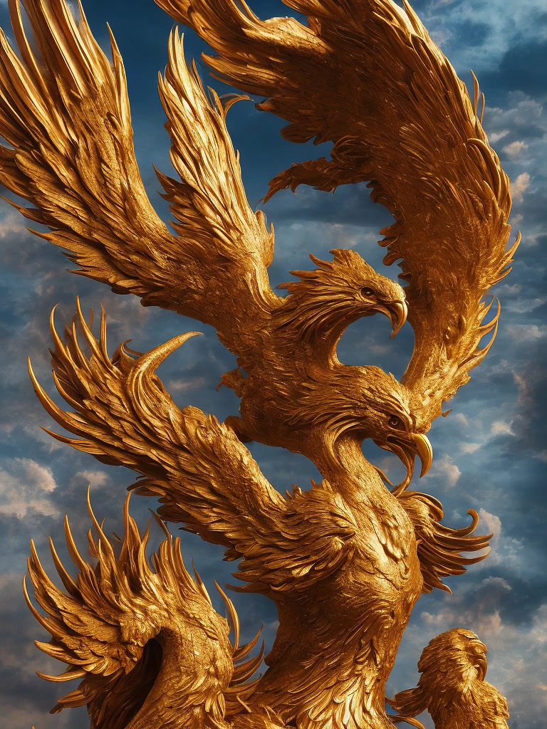A majestic phoenix with vibrant plumage, its fiery wings spread wide, golden feathers illuminating against a dark sky, perched atop a rugged mountain peak, surrounded by swirling clouds, capturing the phoenix's grace and intensity, Sculpture, bronze casting, 8k high definition --ar 1:1 --v 5