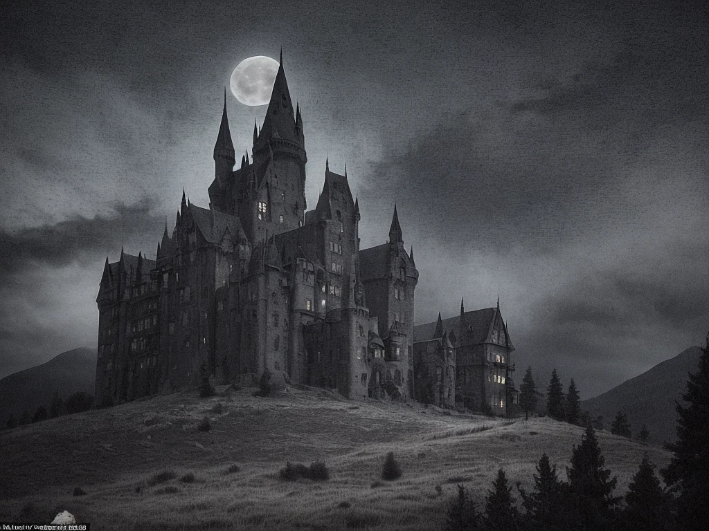 The image depicts a hauntingly beautiful, dark, and ominous scene of a castle in the mountains, with a full moon shining down. The atmosphere is one of foreboding and mystery, suggesting that something sinister or supernatural is lurking in the shadows. The castle is made of rough-hewn, weathered stone, with tall spires and towers that seem to stretch up to the sky like skeletal fingers. The central building is large and imposing, with a heavy, fortified door and narrow windows that seem to stare out like empty eyes. The castle is surrounded by mountains, their rugged peaks shrouded in mist and cloud. The trees surrounding the castle are twisted and gnarled, their branches like withered fingers that seem to reach out to snare the unwary. In the foreground, a winding road leads up to the castle gates, flanked by crumbling stone walls and overgrown with weeds and vines. A rickety bridge spans a narrow chasm, its wooden slats weathered to a soft, silvery gray. The sky above is dark and foreboding, with clouds that seem to boil and twist like living things. The full moon hangs low in the sky, casting an eerie, silver glow over the scene. The lighting is soft and diffuse, with the full moon casting an eerie glow over the scene. The shadows are deep and dark, with a subtle gradient of tone that suggests a sense of depth and dimensionality. The camera perspective is wide-angle, providing a sense of depth and space that draws the viewer into the scene. The camera is positioned at a low angle, looking up at the castle and emphasizing its height and grandeur. The style of the image is reminiscent of a Gothic fairy tale, with a focus on drama, atmosphere, and suspense. The use of dark colors, muted tones, and subtle textures creates a sense of foreboding and unease, drawing the viewer into the haunting world of the image. The camera used is likely a digital SLR camera, with a wide-angle lens and a high ISO range. The image has been processed to enhance the contrast and color saturation, creating a sense of depth and dimensionality that draws the viewer into the scene.