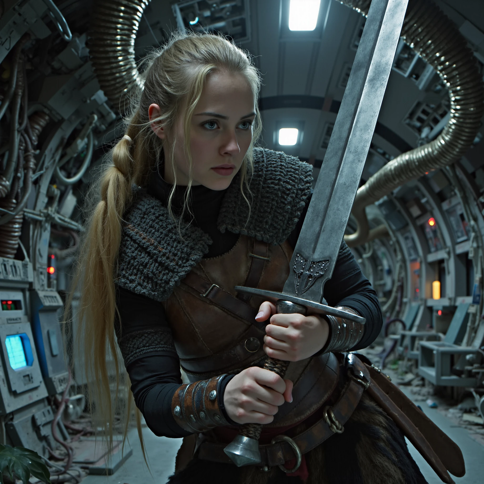 Cinematic close-up shot: A female warrior with the appearance of a Viking Valkyrie. She grips a large sword tightly. She is sneaking cautiously through a dark, expansive alien space station corridor. The station interior is cluttered and strange – think complex machinery, bizarre terminals, and metallic structures twisted in impossible ways. Deep shadows contrast with occasional harsh glows from the environment or distant security lights (maybe blue or red). The atmosphere is tense, almost dark fantasy meets sci-fi. Picture it like a still from a movie scene within this unique blend of settings.