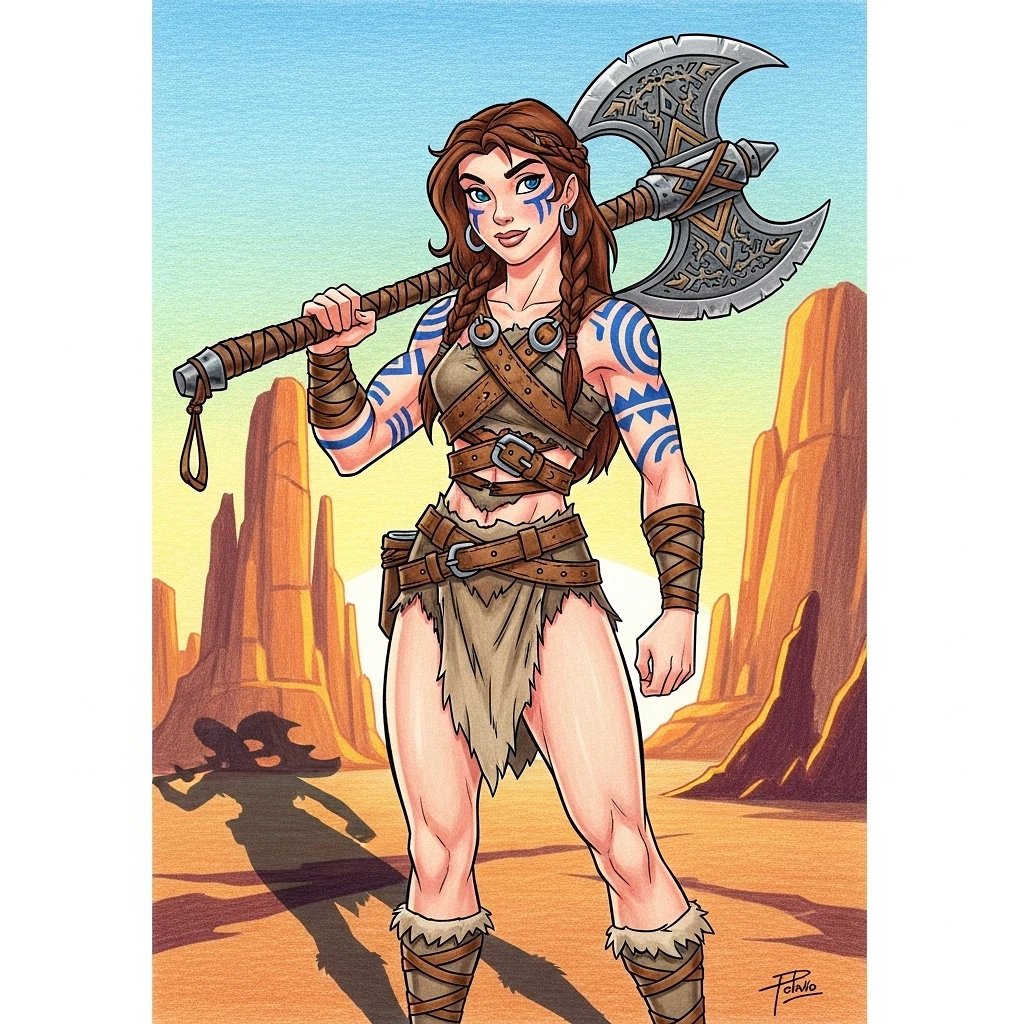 Full body shot of young beautiful European female barbarian woman warrior, muscular, belts and loincloth, tattooed skin, raised by tabaxi in the desert, DnD character concept, carrying a battleaxe, colored pencil art by Robert E. McGinnis, in the cartoon style of Disney princesses --no anime --ar 4:5 --profile jukn738 --stylize 1000 --niji 6