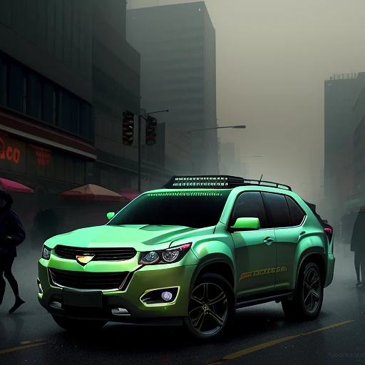 city of pollution, with acid rain in the city, realistic, no huge smoke cloud, people walking around the city with masks on their faces, SUV car in the middle, bright and shiny, around the people with masks on, add the SUV, SUV has bright lights, chevrolet symbol at the bottom, people with masks walk around it, car is bright