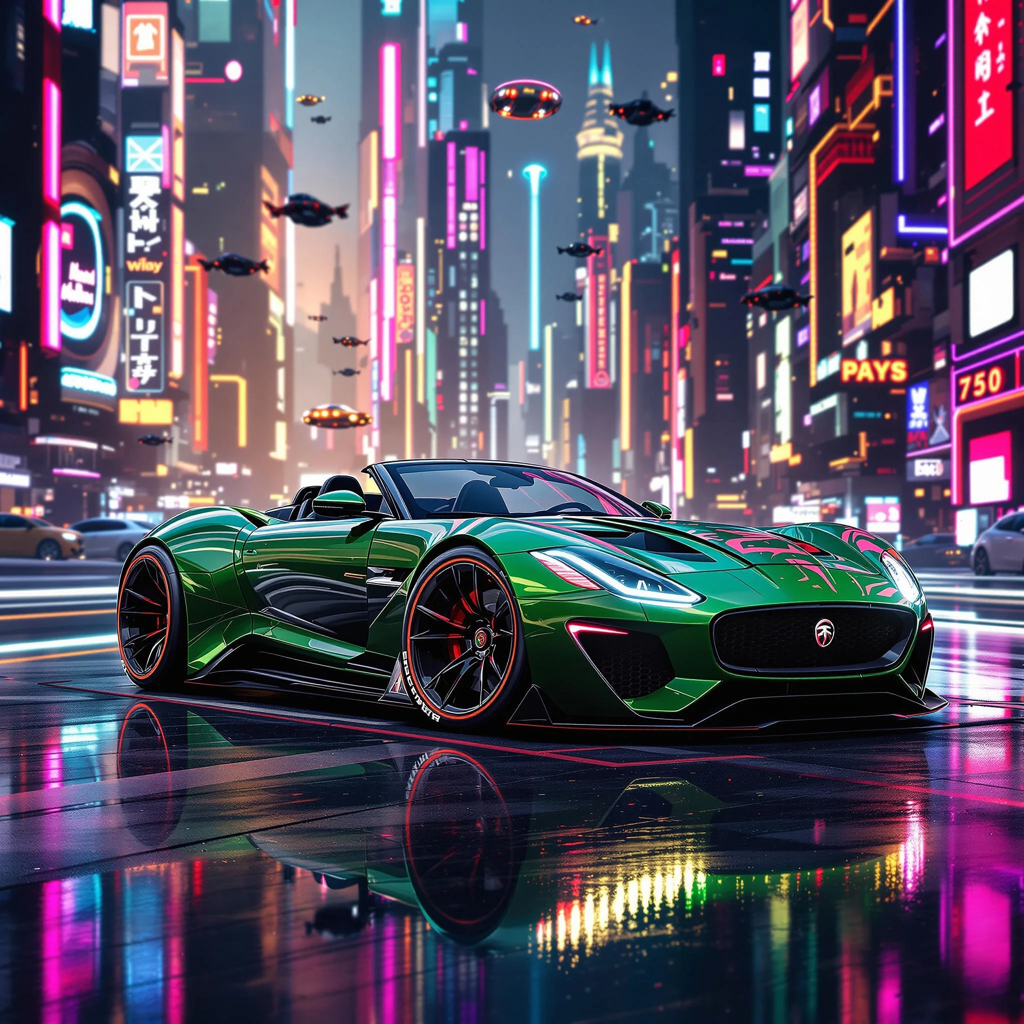 Create a highly detailed and vibrant 16:9 aspect ratio image of a futuristic Jaguar F-Type convertible. The car should have a wide body design, jet engines on each side, and be in British racing green color. It should be depicted as sleek, aerodynamic, and set against a high-tech futuristic cityscape with neon lights, advanced architecture, and flying vehicles. The image should be highly detailed and vibrant, incorporating the specified features and colors to create a visually striking and futuristic scene. Please ensure that the image has a stylized effect with a value of 750.