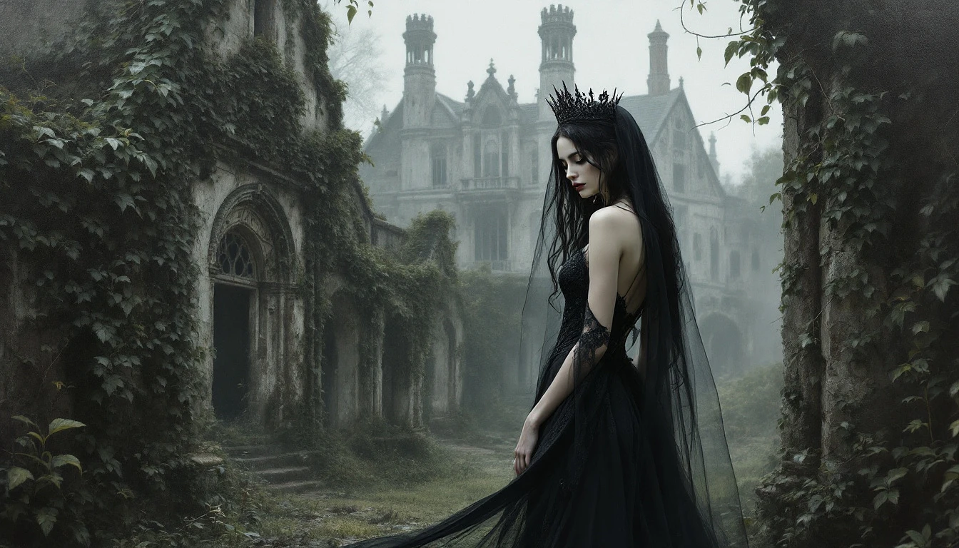 ultra-detailed oil painting:1. 3, impasto:1. 2, high relief texture:1. 2, hyper realistic style:1. 3, female:1. 5 with delicate pale skin, graceful posture, back partially turned, head slightly bowed, long black wavy hair:1. 3, wearing a flowing dark gown with subtle gothic lace, a sheer black veil covering her head, held by an elegant black crown, standing in a decaying overgrown garden, ancient ivy-covered stone ruins, soft mist, cinematic composition, fine soft shadows over her profile, muted softly textured artistic background, rich painterly brush strokes, melancholic and mysterious mood, gothic romanticism, inspired by Edgar Allan Poe’s The Fall of the House of Usher, full view of the mansion in the background, mansion architecture highly detailed and crisp, panoramic scene capturing both character and environment, masterpiece, 8K ultra HD, aspect ratio 16:9.