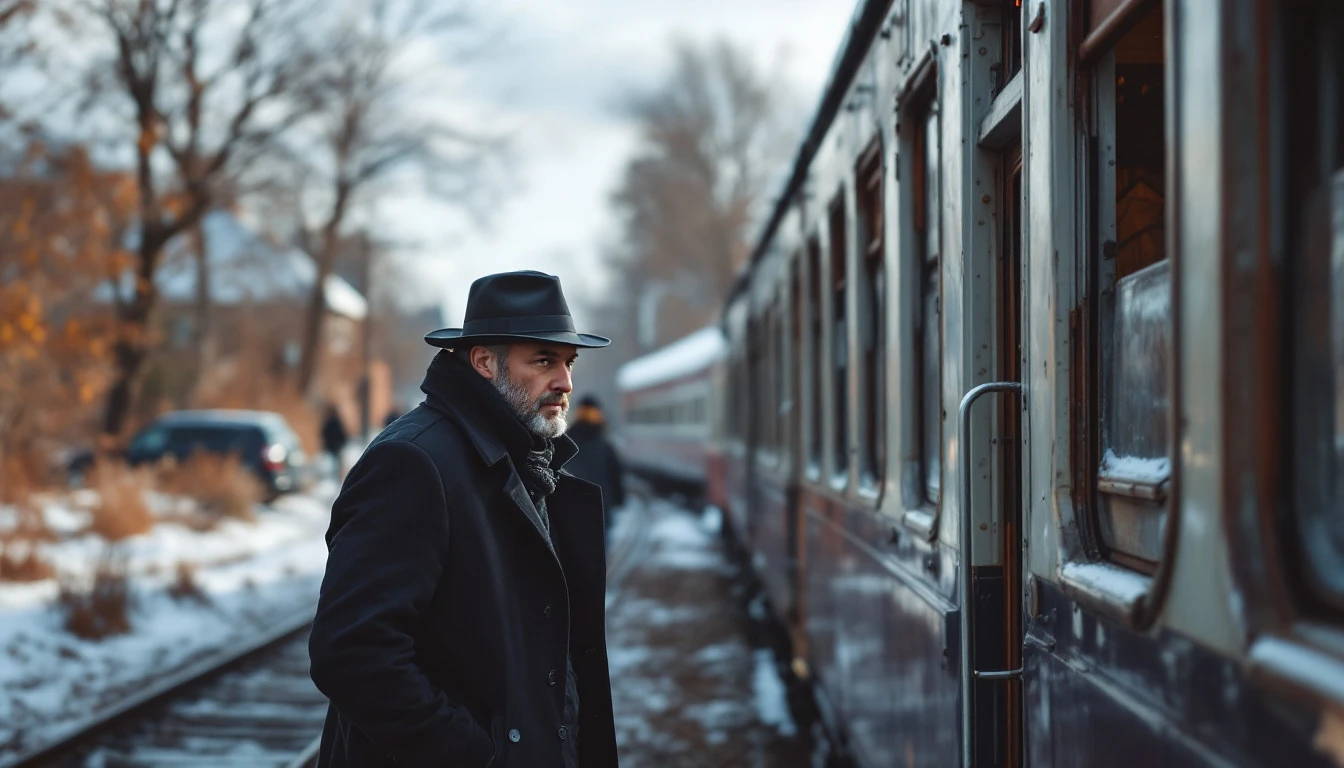 high definition - a man wearing black coat and hat getting ready to board a train in a village