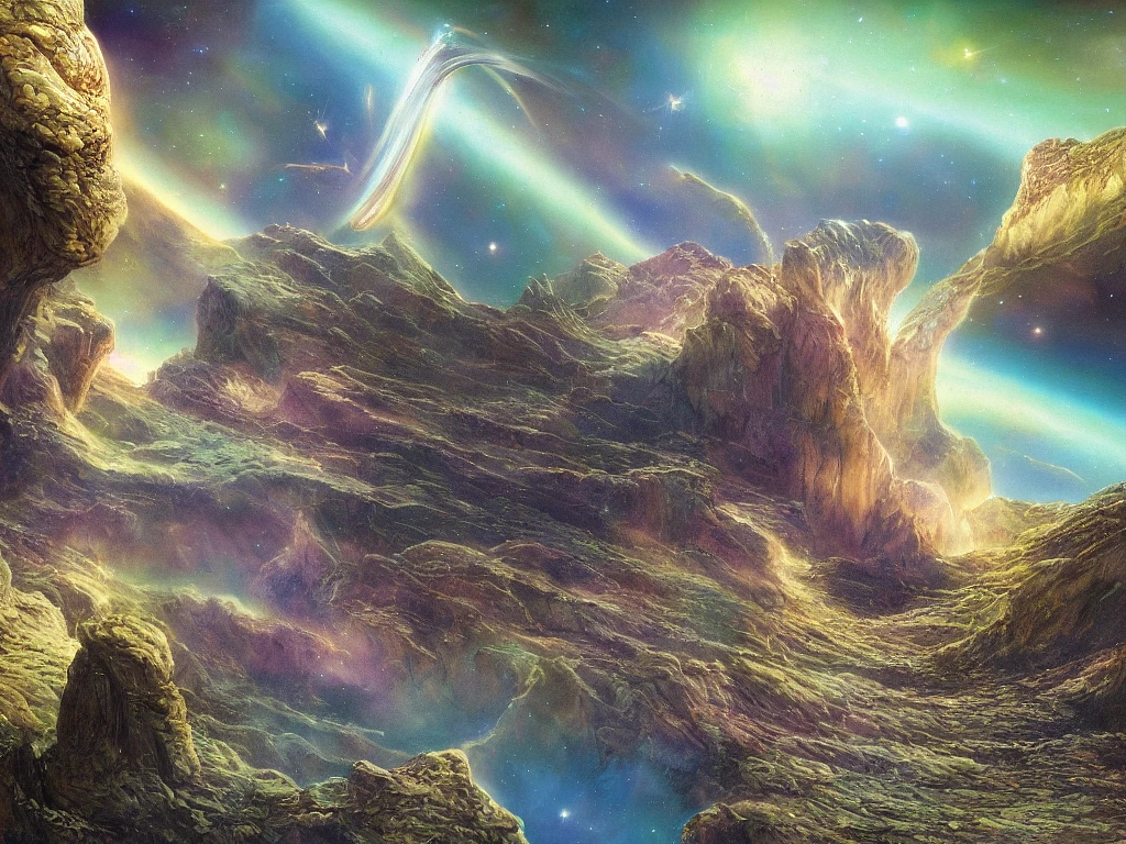Andromeda galaxy, high resolution photography, dreamy location, photo realistic, realistic light, wide angle, A D architecture, roger dean style, biblical, god.