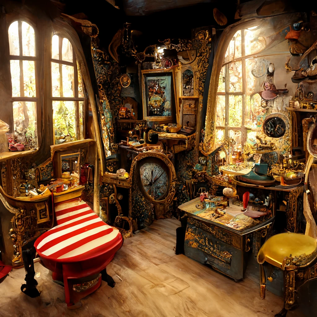 ultra realistic room, mad hatter's work bench, top hats, measuring tape, scissors, tan walls, wood floor, antique gold chair in one corner, alice in wonderland style