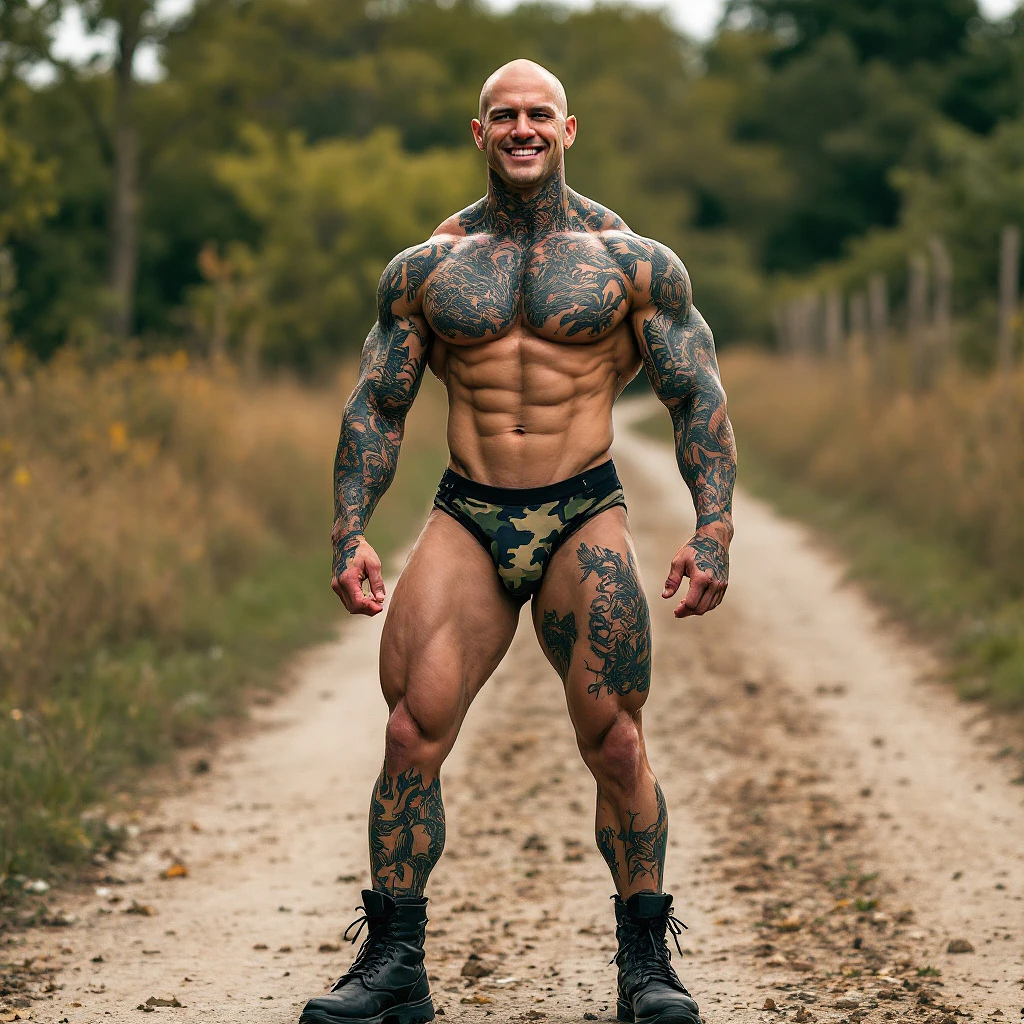 Full body image, tall fit slim white irish bodybuilder, heavily tattooed, slim face, chiseled jawline, shaved head, big dick in camouflage print thong underwear, big feet in black combat boots, big smile, standing outside on dirt road