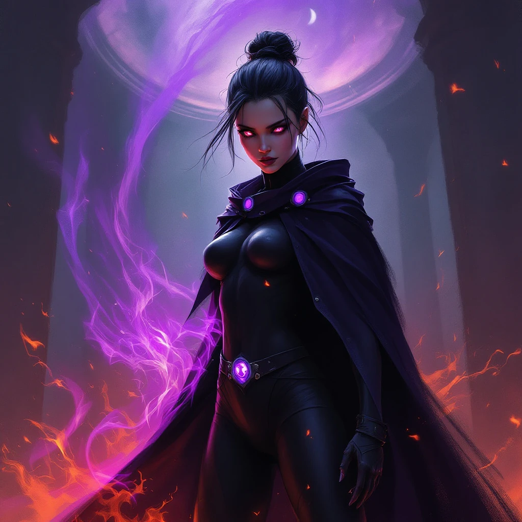 simple blurry brush digital painting in the style of warhammer 40k of a female psyker, 14 years old, standing infront a gothic circh, channeling pruple and orange hellfire magic, cybereyes, black tight tight onepiece suit, mantle with high collar, look towards camera