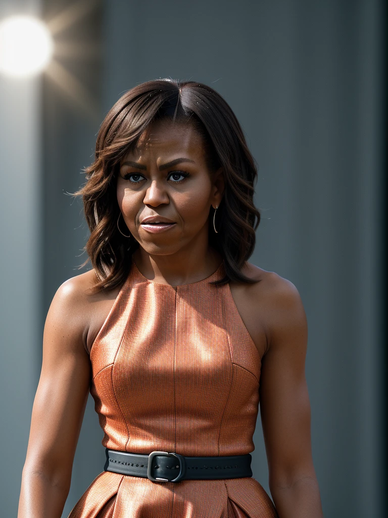 portrait of Michelle Obama dressed like a man, ultra realistic, 8k full HD, low angle, unreal engine 5, cinematic, masterpiece, insane detail, real photography, bright colors, sun-soaked colours, Fujifilm X-T4, Sony FE 85mm --ar 900:1600 --s 750 --style raw --v 5. 2