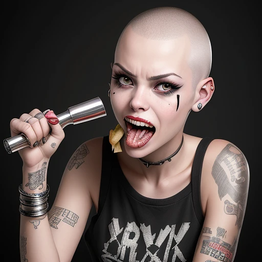 Young rebellion punk woman with a shaved head. Her mouth is wide open, screaming from the top of her lunch. Her silver and chrome teeth tension away how she is feeling, silver-gronts, grills