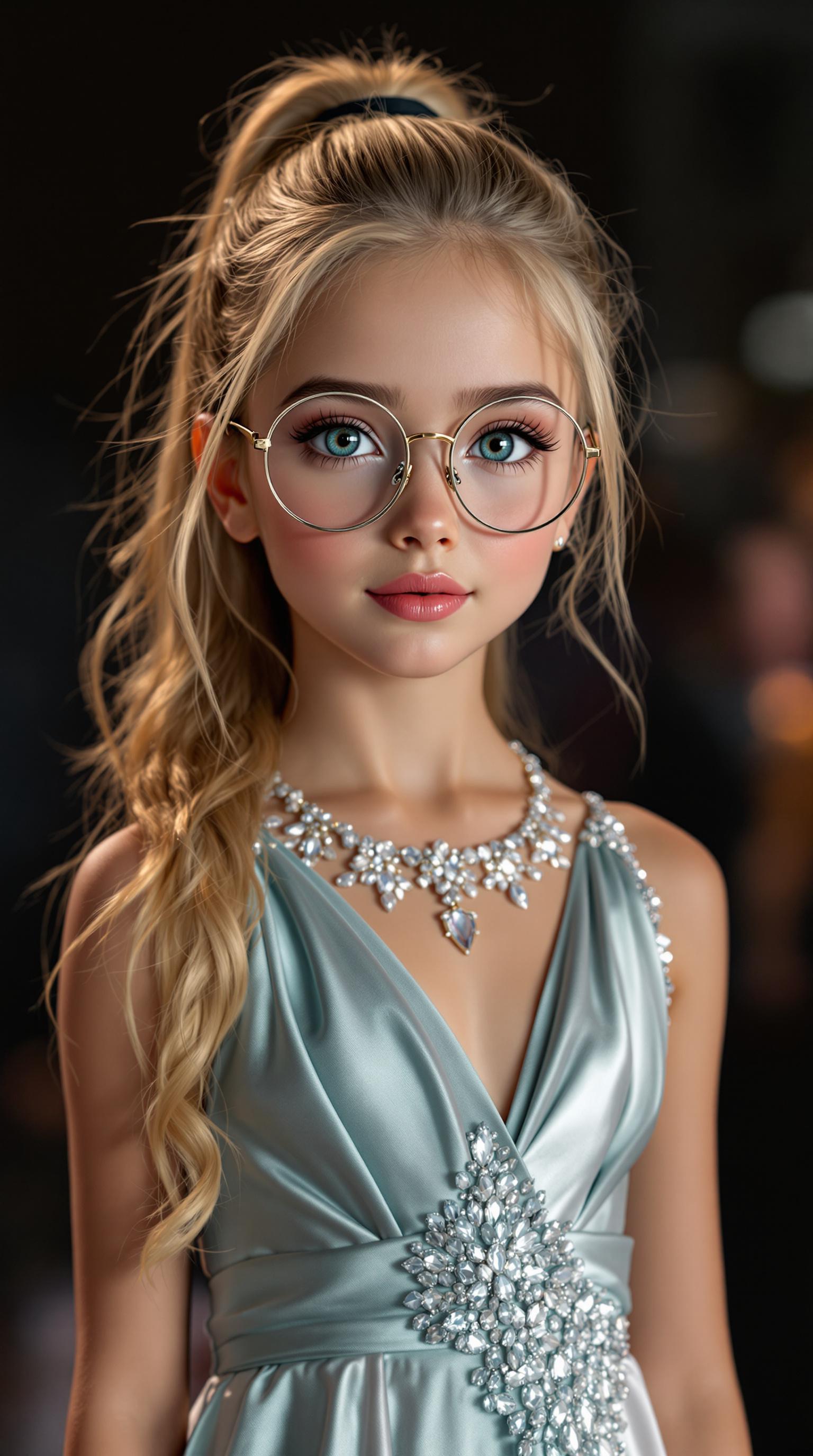 A professional photograph of the most beautiful second-grade girl in the world, participating in a beauty pageant. The image is highly detailed and realistic, showcasing her full body. She has long sandy blonde hair styled in a ponytail and flawlessly smooth light olive skin. Her makeup includes thick black eyeliner, exceptionally long eyelashes, light pink blush, exquisitely shaped lips with light pink lipstick, and peach eyeshadow. Her olive skin is perfectly flawless, complemented by beautifully defined high cheekbones. Her large, brilliantly shaped eyes display a unique forest tea blue-grey-purple hue wear harry potter style glasses, rendered with extreme detail. Her fingernails are beautifully manicured with pink polish. She is dressed in a sleek evening gown, standing on a stage and looking directly at the photographer. The photograph features a high depth of field and is created using Unreal Engine 5 and Octane Render, resulting in a high-resolution image with intricate details and ultra-sharp focus. The image is of the highest quality, 8K resolution, ultra-detailed, and photo-realistic, presented in a front full-body view with dramatic volumetric lighting and perfect graphics. Negative prompts exclude Asian features, low resolution, text, errors, cropped images, poor quality, and various anatomical inaccuracies such as extra or mutated limbs, poorly drawn features, and watermarks or signatures.