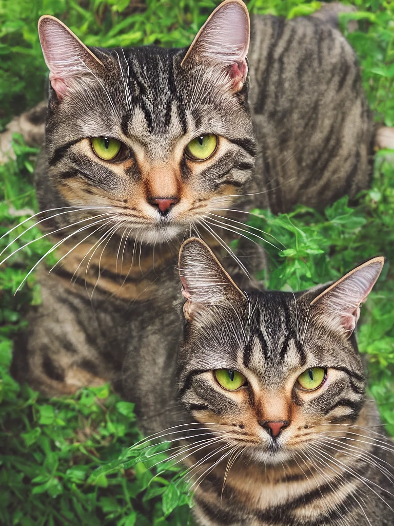 A psychedelic portrait of a beautiful and elegant tabby cat, lovely face, stunningly beautiful eyes, lively realistic, photorealistic, intricate hair details, upfront, 4K, 50mm lens, f2. 8, symmetrical, hyper realistic, sharp image, garden in the background