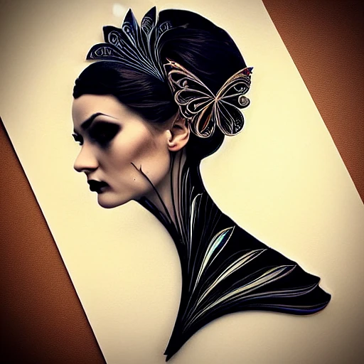 paper quilled beautiful woman in black moth wing dress, goth, goth appearance, in the style of JUDITH ROLFE, face by Artgerm, night forest background, hyperrealism, elegant, beautiful, --ar 9:16