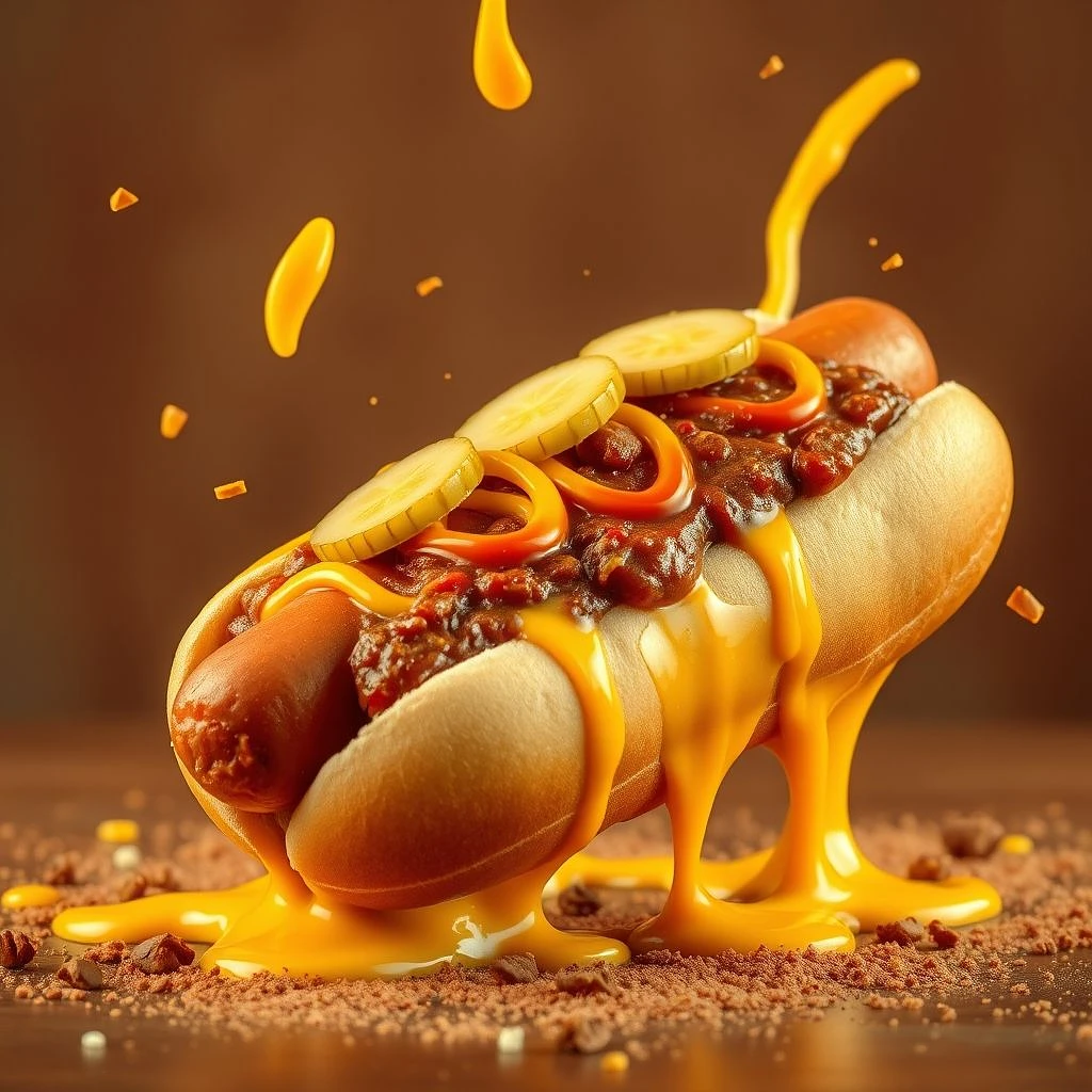 A hot dog, likely a chili dog, is the central focus of the image. The hot dog is positioned diagonally, with the top slightly out of frame and the bottom portion more prominently displayed. It sits within a light golden-brown bun. The hot dog itself is a reddish-pink color, and has a slightly visible texture. The bun is topped with a generous amount of chili, visible as a reddish-brown filling. Pickled cucumbers, slices of a light green color, are also present on top of the chili. Yellow mustard and red ketchup are drizzled atop the chili and cucumbers, forming streaks and splashes that appear in motion. A significant amount of melted, vibrant orange-yellow cheese is splashing and cascading around the hot dog, adding a further dynamic element to the image. The background is a deep, burnt orange or amber hue, contributing to the overall theme. Small particles of what looks like bread crumbs or spices are also visible throughout the image. The entire composition evokes a sense of motion and abundance. ultra-detailed Ultra-realistic cinematic view full hd 8k