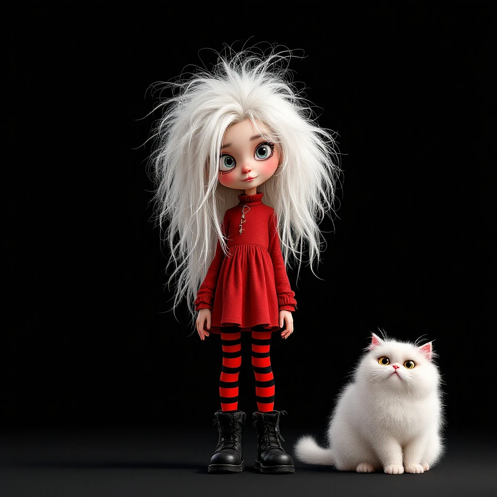 3D illustration, a young girl withe long, shaggy, messy and exaggerated white hair. Red dress with black and red striped tights and big black boots. She has a fat and fluffy white cat next to her. Black background. --ar 2:3