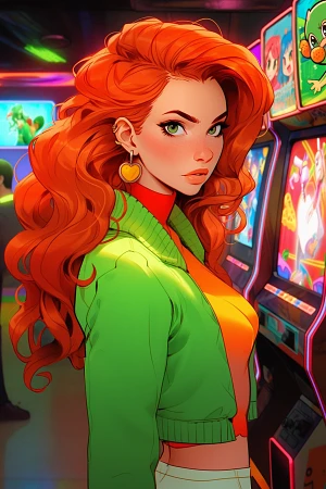 A playful and mischievous game character, 2010s Decor style, with bold makeup, Arcade 1990s Point And Click 16 Bit Adventure Game art by Mike Ploog, vibrant green eyes, vivid red lips, fiery orange hair, neon green accessories, a sparkling decoration, spiky hairstyle, ancient dynasty feature, dazzling amethyst fiber, a magical staff, and mysterious dark floral clothing --q 2 --niji 5 --ar 2:3