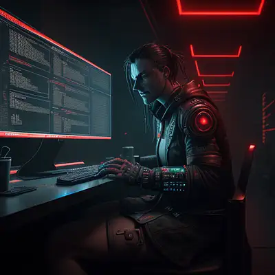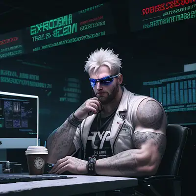 Hyper realistic eye level exterior photo of The Trading room is digital art dim, with only the white light from the screens illuminating the room. The alpha dog Trader is sitting in front of a wall of large trading screens, typing code on a keyboard. He wears cyberpunk crypto coin implants and drinks extra large coffee. He loves coffee. The programmer is surrounded by chaos, hyper realism, high detail, octane render, celestial arena,  fire storm,  ice storm,  body crackling with lightning,  lightning halo,  tilted halo,  crackling lightning,  lightning charged atmosphere,  beautifully detailed fur,  brilliant detailed eyes,  beautifully detailed face, but he doesn't seem to notice or care. Digital Art. 3D Render 8k