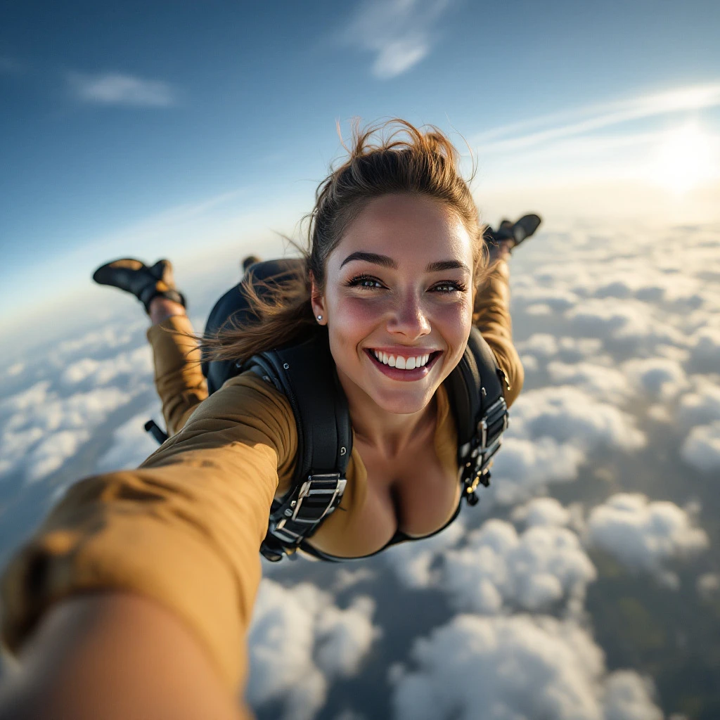 Go back female parachutist, jumping from plane, smile, selfie, motion, full body visible, detailed skin, realistic, photo-realistic, 8k, highly detailed, full length frame, High detail RAW color art, diffused soft lighting, shallow depth of field, sharp focus, hyperrealism, cinematic lighting